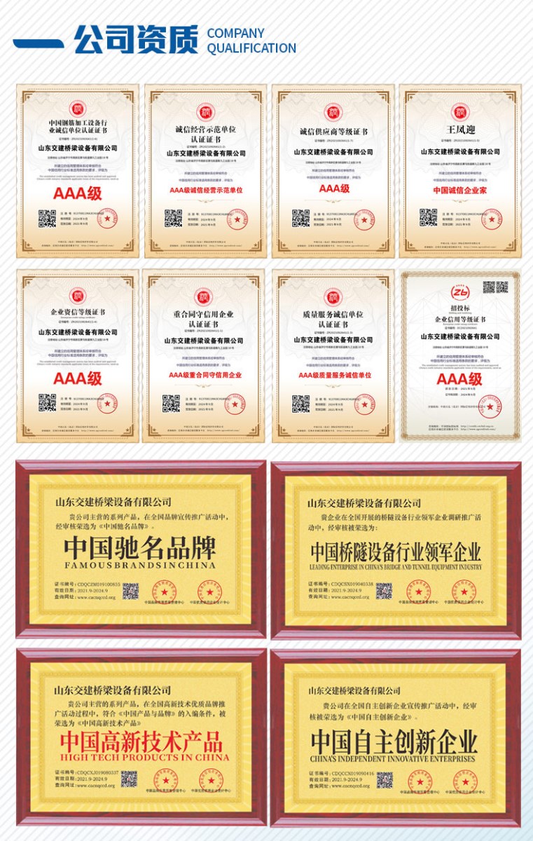 山東交建橋梁設備有限公司主要經營數控鋼筋彎曲中心二機頭、數控鋼筋彎曲中心五機頭、數控鋼筋彎箍機、數控鋼筋籠滾焊機、鋼筋調直切斷機、鋼筋墩粗機等一系列鋼筋加工設備。